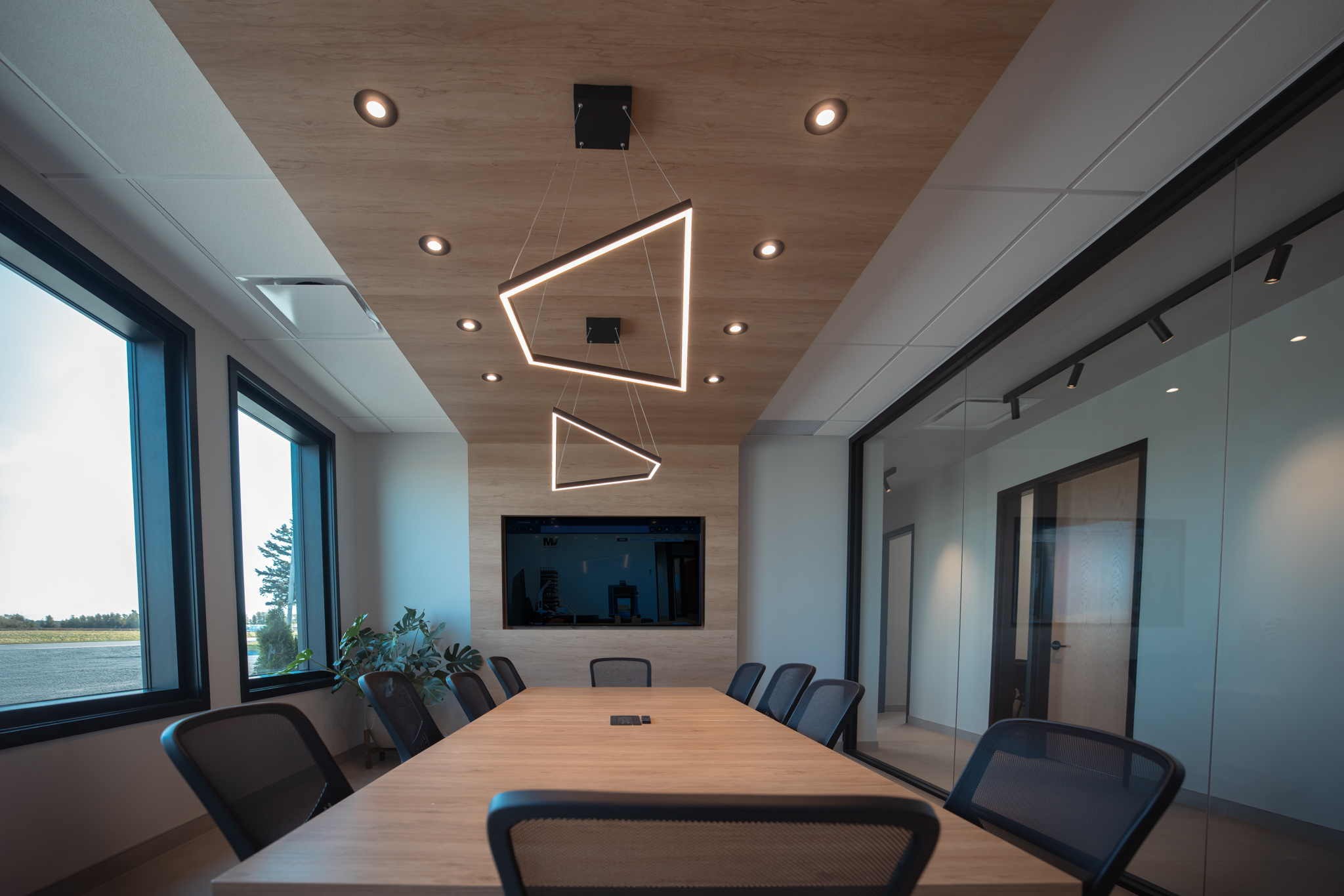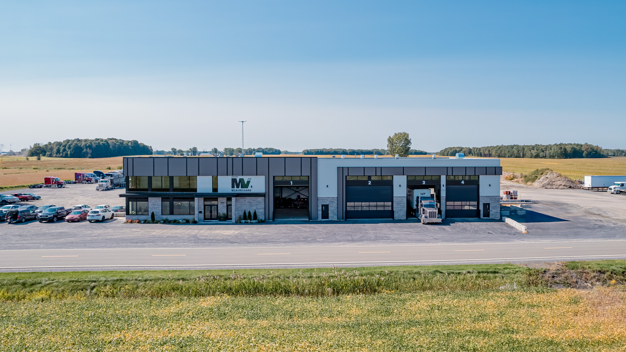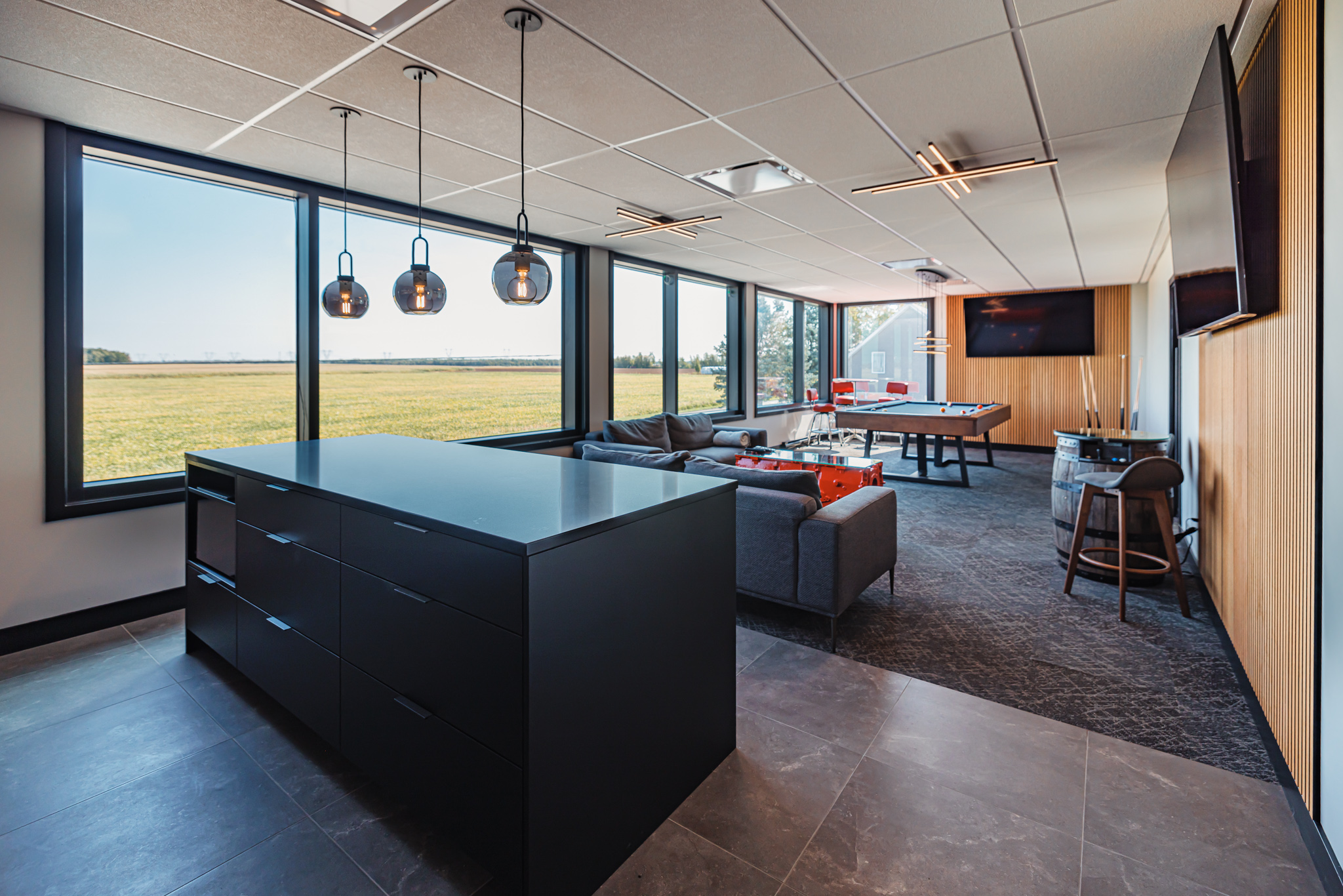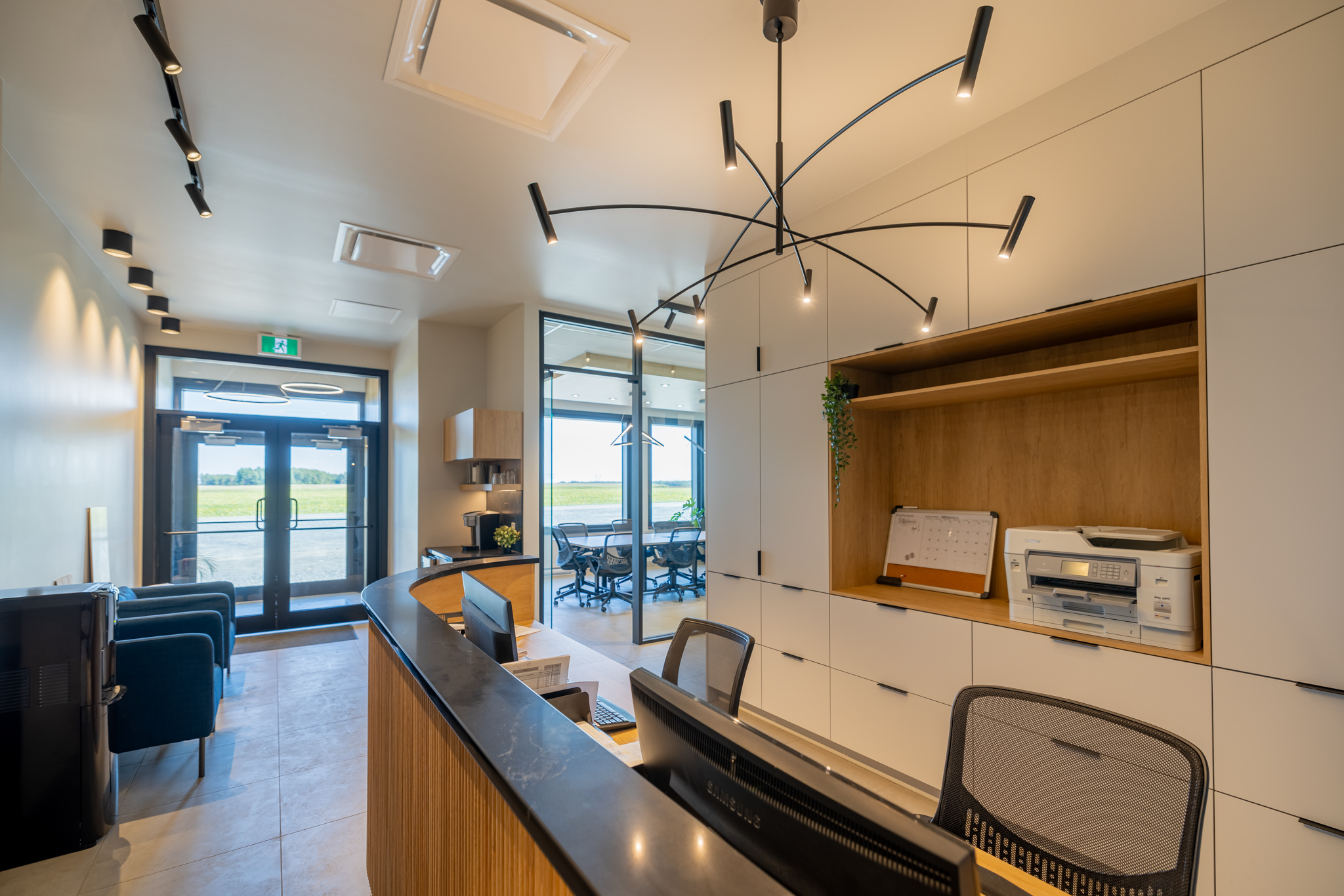 Ce bâtiment, implanté dans un secteur agricole, offre des espaces de bureau avec fenestration abondante offrant luminosité et vues spectaculaire vers le paysage ambiant.